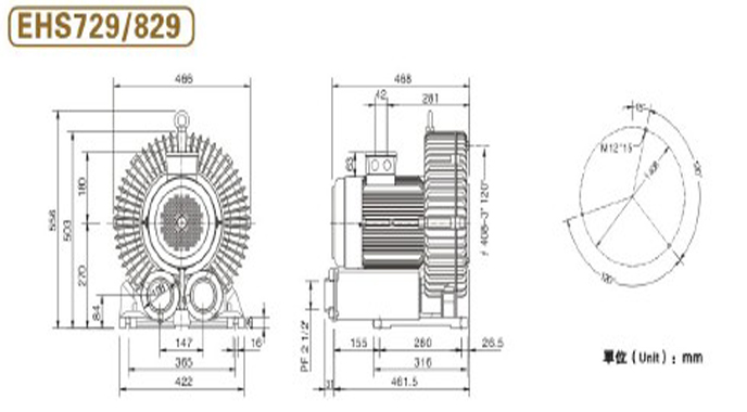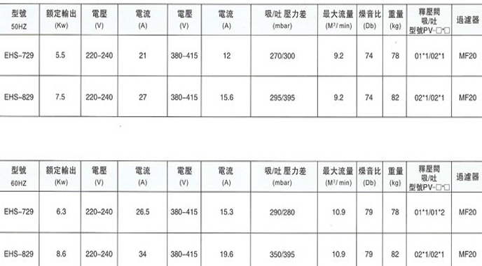 EHS729/829 離心式高壓鼓風機特點:壓力高 風量大 無油氣 免保養 壽命長 低震動,高風壓 體積小,重量輕 低噪音,新設計規格:三相交流電 50HZ/60HZ 最大風量:5.2立方米/6.2立方米功率:2200W/2600W 電壓:200-240V/220-240V 346-415V/380-480V 電流:6.7A/10.6A 5.6A/6.1A