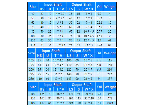 為降低蝸桿牙口和蝸輪齒部齒合時之集中磨耗,本公司產品中下列型號(SIZE)之實際速比,采用(追逐齒輪)(HuntingTooth)速比設計為非整數比,敬請用戶注意。