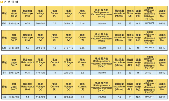 單段鼓風機EHS329/339工作原理離心式風機重量14.5 高壓風機 :采用德國先進技術,在通過加上一體式的銷音設施,改進了高壓風機靜音現像,而提升了靜音的效果2、可靠性高當使用情況變化時,機器仍可安全運轉。除了葉輪之外,高壓鼓風機沒有其他動作,因此可靠性之高幾乎免維修。使用獨一無二且散熱良好的精密外側軸承,因此它具有下列優點:高壓縮比;軸承運轉溫度低;潤滑油脂壽命長;免保養。 3.安裝容易 配備齊全,可隨時安裝與使用,供壓縮空氣或用于抽真空,也可任意安裝于水平或垂直的方向。 4.無油無污染 葉輪旋轉時,不與任何部分零件接觸,免潤滑,因此可保證百分之百無污染。 5.最高品質 經過17年的專業制造經驗,最精密機械設計加上慎重電機配合標準儀器測試,使用所有零件均能達到最高品質要求,運用標準ip54,f級馬達效率高,故障極少,馬達與鼓風機之間有軸封分試,預防異物進入。同時為確保功能效果,每一臺鼓風機在出廠前均經過嚴格測試。 6.電壓:萬國電壓型,50HZ 60HZ均可用,無論您的產品是出口至歐美的使用60Hz,高電壓的國家,還是中東,非洲等使用50Hz電壓的國家及地區,本風機均能達到要求,功能產齊全,讓您無后顧之憂! 適應行業:劍桿織機、絲網印刷機、成像機、照排機、切紙,醫療設備,食品機械,各式燃燒機,鍋爐設備,環保設備,木工機械、除塵設備,pcb設備,除濕干燥機清洗設備,,吸塵設備,公共場所供氧,干洗設備,等等。