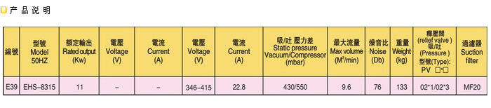 雙段鼓風機EHS8315(旋渦氣泵)是一種吹氣或吸氣兩用的通用氣源。風機,高壓風機,鼓風機,升鴻高壓風機,瑞昶風機,旋渦氣泵,吸風泵,吸料風機,真空泵,側流風機它主要用于:切紙機,燃燒降氧機、卷煙濾嘴成型機、電鍍槽液攪拌、霧化乾燥機、水處理爆氣、水產、絲網印刷機、照相制版機、注塑機自動上料烘干機、液體灌裝機、粉末灌裝機、電焊設備、電影機械、紙張運送、清潔用途、空氣除尖、干瓶、氣體傳送、送料、收集等方面 功率:0.18KW 0.4KW 0.75KW 1.1KW 1.75KW 2.2KW 3.7KW 4KW 5.5KW 7.5KW 9KW 13KW 20KW EHS-129 EHS-229 EHS-329 EHS-339 EHS-429 EHS-439 EHS-529 EHS-629 EHS-639 EHS-729 EHS-829 EHS-919 EHS-929 EHS-939 EHS-4337 EHS-4346 EHS-6346 EHS-6355 EHS-6375 EHS-6455 EHS-6475 EHS-8310 EHS-8315 EHS-8320 EHS-8410 EHS-8415 EHS-9320 EHS-9325 EHS-9420 EHS-9425 風壓:50mbar~650mbar 風量:40立方/小時~1134立方/小時(為方便選用不同規格,單段式/雙段式均有貨提供) 頻率:50Hz/60Hz 電壓:110V~615V(萬國電壓,各國均可使用。如需特殊電壓,可按要求定做) 釋壓閥 RV-01 RV-02(配套使用) 過濾器 MF8 MF10 MF12 MF16 MF-20 MF-32 本公司有專業的相關技術工程師,歡迎廣大客戶來電來函咨詢相關業務--風機,高壓風機,鼓風機,升鴻高壓風機,瑞昶風機,旋渦氣泵,吸風泵,吸料風機,真空泵,側流風機。