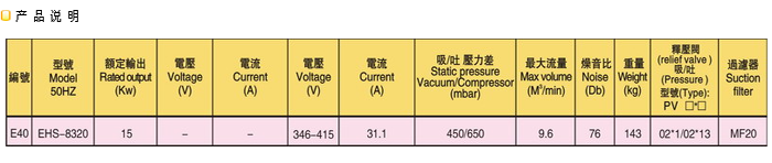 雙段鼓風(fēng)機EHS8320風(fēng)機特點:1.超靜音型,無噪音: 采用德國先進技術(shù),馬達直接運轉(zhuǎn),在通過加上一體式的銷音設(shè)施,改進了高壓風(fēng)機噪音大的現(xiàn)像,從而達到靜音的效果。 2.可靠性高當使用情況變化時,機器仍可安全運轉(zhuǎn)。除了葉輪之外,高壓鼓風(fēng)機沒有其他動作,因此可靠性之高幾乎免維修。使用獨一無二且散熱良好的精密外側(cè)軸承,因此它具有下列優(yōu)點:高壓縮比;軸承運轉(zhuǎn)溫度低;潤滑油脂壽命長;免保養(yǎng)。 3.安裝容易 配備齊全,可隨時安裝與使用,供壓縮空氣或用于抽真空,也可任意安裝于水平或垂直的方向。 4.無油無污染 葉輪旋轉(zhuǎn)時,不與任何部分零件接觸,免潤滑,因此可保證百分之百無污染。 5.最高品質(zhì) 經(jīng)過17年的專業(yè)制造經(jīng)驗,最精密機械設(shè)計加上慎重電機配合標準儀器測試,使用所有零件均能達到最高品質(zhì)要求,運用標準ip54,f級馬達效率高,故障極少,馬達與鼓風(fēng)機之間有軸封分試,預(yù)防異物進入。同時為確保功能效果,每一臺鼓風(fēng)機在出廠前均經(jīng)過嚴格測試。 6.電壓:萬國電壓型,50HZ 60HZ均可用,無論您的產(chǎn)品是出口至歐美的使用60Hz,高電壓的國家,還是中東,非洲等使用50Hz電壓的國家及地區(qū),此款環(huán)保風(fēng)機均能達到要求,功能產(chǎn)齊全,讓您無后顧之憂! 適用范圍:環(huán)保工程 產(chǎn)業(yè)機械,塑膠機械(除濕干燥機),印刷機械(絲網(wǎng)印機),照相制版,pcb設(shè)備,電器設(shè)備,醫(yī)療設(shè)備,各式燃燒機,鍋,環(huán)保養(yǎng)殖業(yè)等等